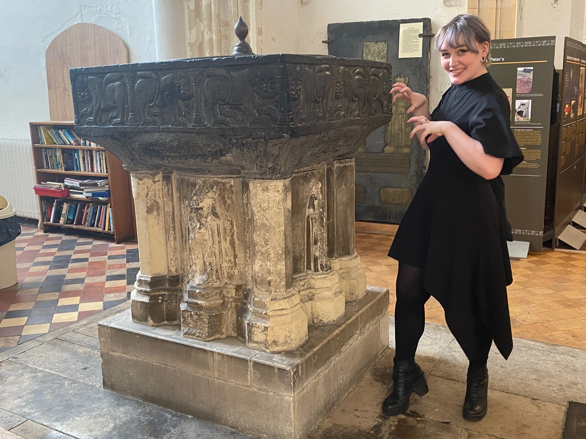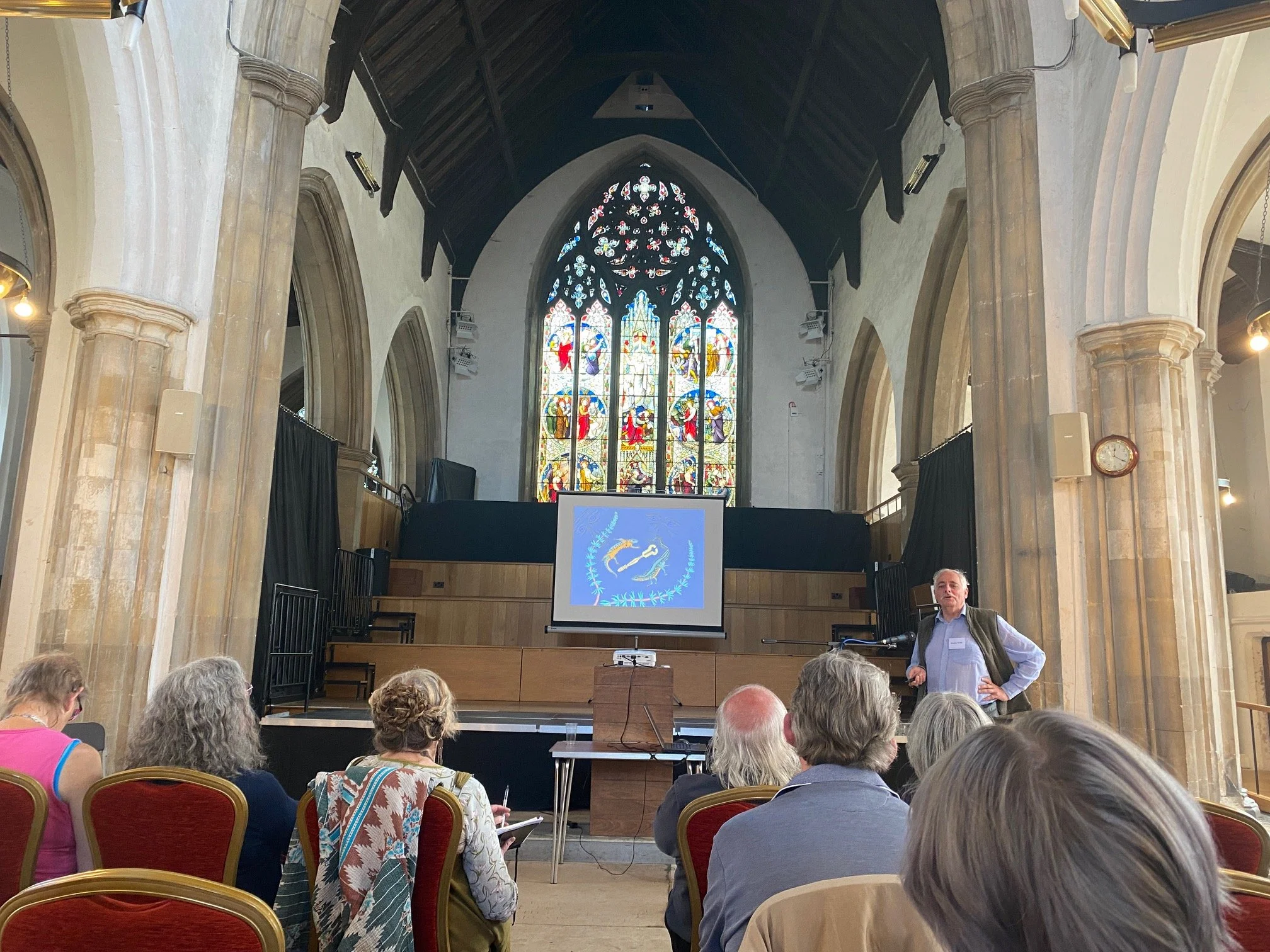 I presented my talk and slides on River Mermaids and Miracles from the River Clyde at the Water in Legend and Tradition, 18th Watery Weekend. The Folklore Society organised this, and you can see me (1st & 3rd photos) in the fantastic venue - St Peter’s by the Waterfront in Ipswich, England. Also, the Greenock Mermaid (2nd photo) on a gable end in Greenock, Scotland - I told her tale. There’s a picture of Jeremy Harte, who organised the event and gave a world-class presentation. And last but not least a photo of Katie Marland, by the lion carved font - Katie is an artist extrodinaire and researcher in myth and legend; her presentation on the Dobhar-Chu was excellent. (It’s a big devil-otter creature)